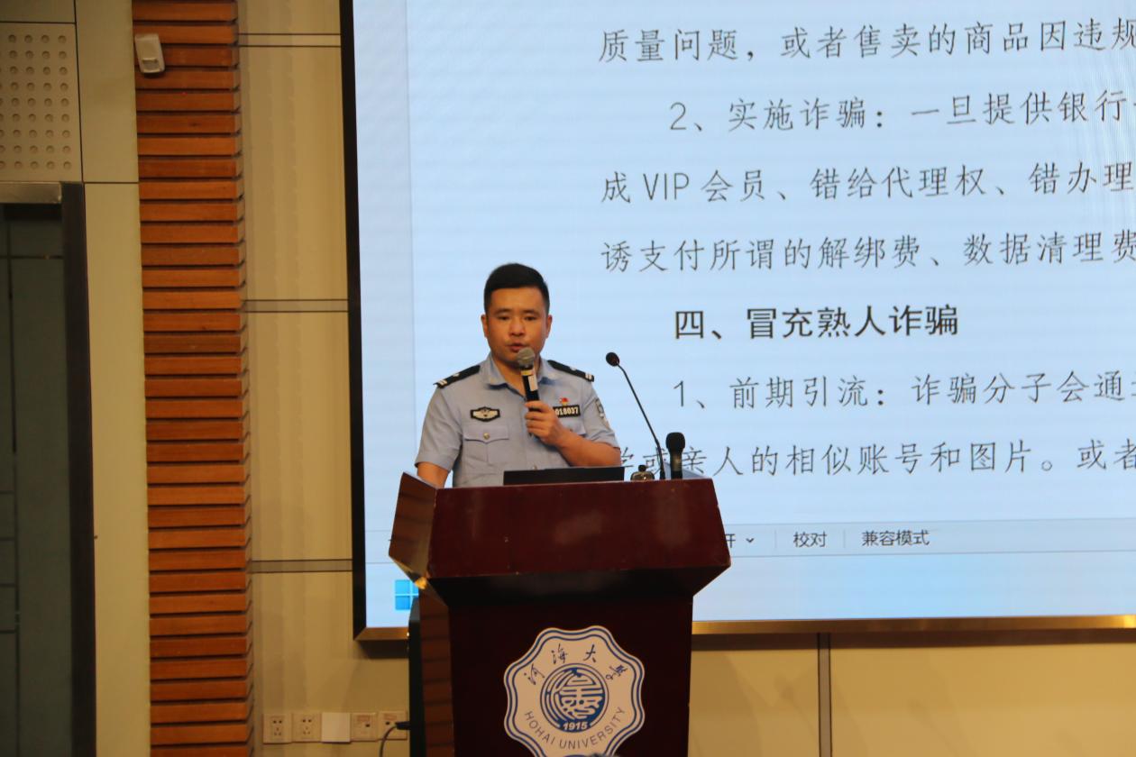 为切实筑牢校园安全防线,9月20日上午,亚洲太阳sungame首页邀请江宁开发区派出所曹警官在江宁会议中心二楼,为2025级新生举办了一场反诈专题讲座,由2025级本科生辅导员侯开智主持,352名2025级全体新生参加。