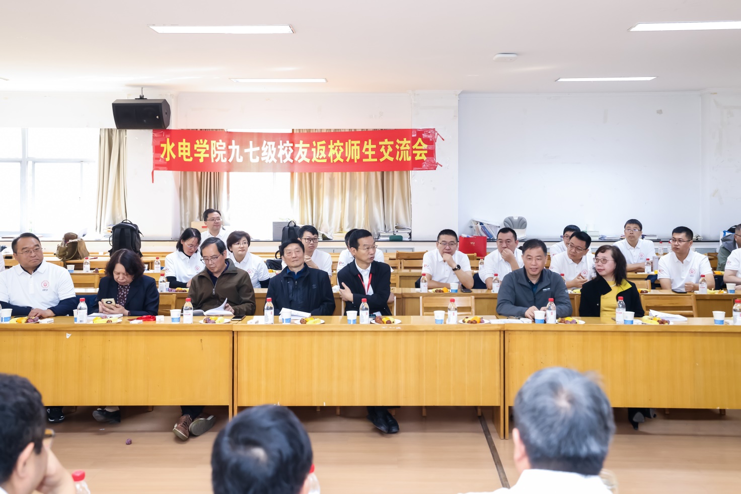 “看到大家在各自领域发光发热,作为老师倍感骄傲!”时任班导师蔡付林和郑源教授细数校友们二十八载的成长与成就,言语间满是欣慰与自豪。时任学院书记白明进特别叮嘱同学们,在大家这个奋斗打拼的年龄,都是各单位的中流砥柱,特别要注意身体。教学秘书何奇芳老师深情回忆了与水电97级学子相处的点滴时光,“当年的青涩少年,如今已成行业骨干,这份情谊从未因时间而褪色。她回顾了水电97级学子在校时的勤奋与坚韧,鼓励校友们继续秉持水利人的初心,在新时代水利事业发展中勇担使命、再立新功。”校友们也纷纷打开话匣子,分享二十八载的人生感悟与职业历程:有的校友扎根雅下工程、南水北调、淮河入海水道二期等重大水利项目一线;有的校友长期奉献在雪域高原,为“冰山雪莲”浇灌智慧源泉;有的奋战在边疆西陲,用实干诠释“治水兴邦”的誓言;有的校友深耕水利科研领域,在工程材料、水旱灾害防治等方面取得突破性成果;有的校友投身水利教育事业,培养了一批又一批新时代水利人才;有的校友拼搏在异国他乡的“一带一路”,为人类命运共同体而奋斗…… 现场温情涌动,掌声与笑声此起彼伏,师生间的情谊在交流中愈发深厚。
