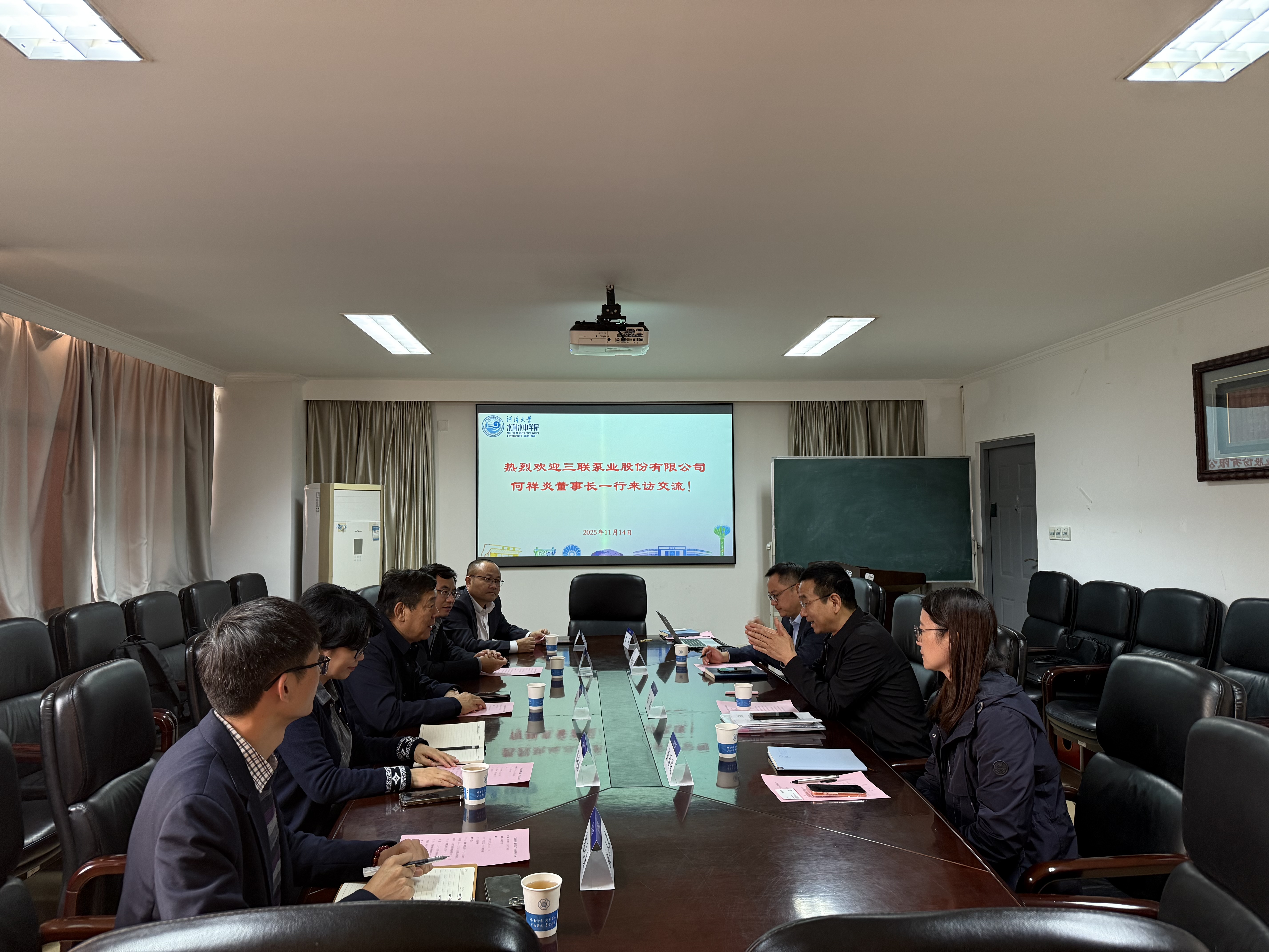 11月14日,三联泵业股份有限公司董事长何祥炎一行来访学院调研交流,江苏海壹环境科技有限公司总经理陈存根、河海大学苏州研究院副院长许航、三联泵业股份有限公司人事总监陈锁玲、人事经理鲍小康一同到访。学院党委书记娄健、党委副书记戴媛媛、副院长俞晓东、辅导员陈辰出席座谈会,双方围绕学科建设、人才培养、产学研协同创新等核心议题展开深度交流。