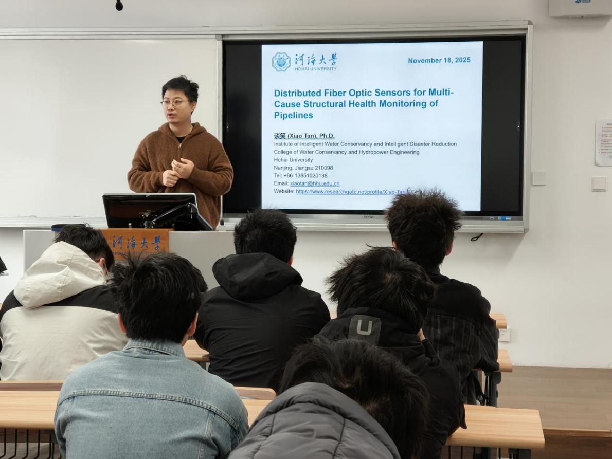 2025年11月18日,亚洲太阳sungame首页安全工程系副系主任谈笑在常州校区2号楼A207教室主讲《基于分布式光纤传感器技术的管道多因素结构健康监测》专题学术讲座。2024级安全工程一班全体同学参加本次讲座,讲座旨在搭建学术前沿与专业学习的桥梁,助力学生深化对安全工程领域核心技术的认知。